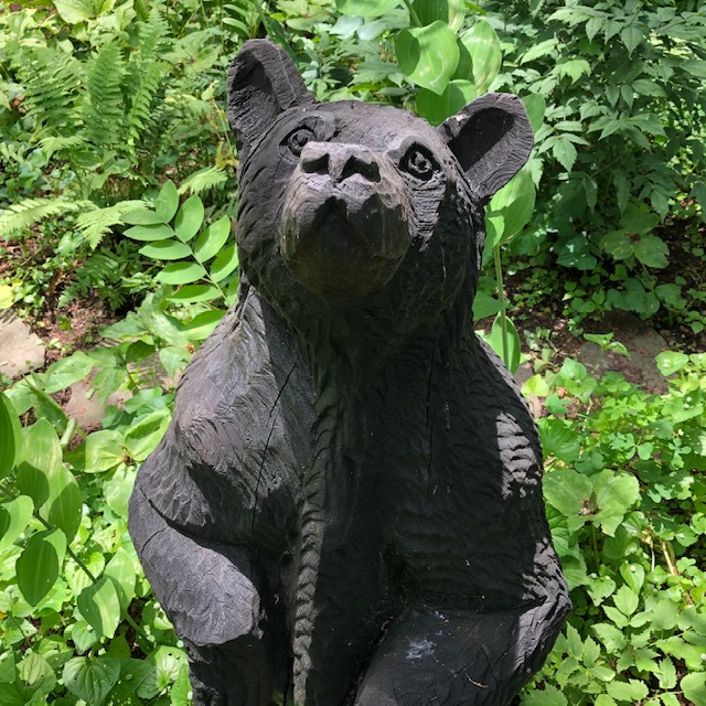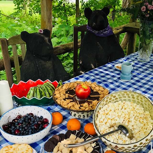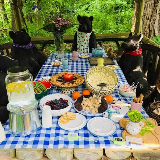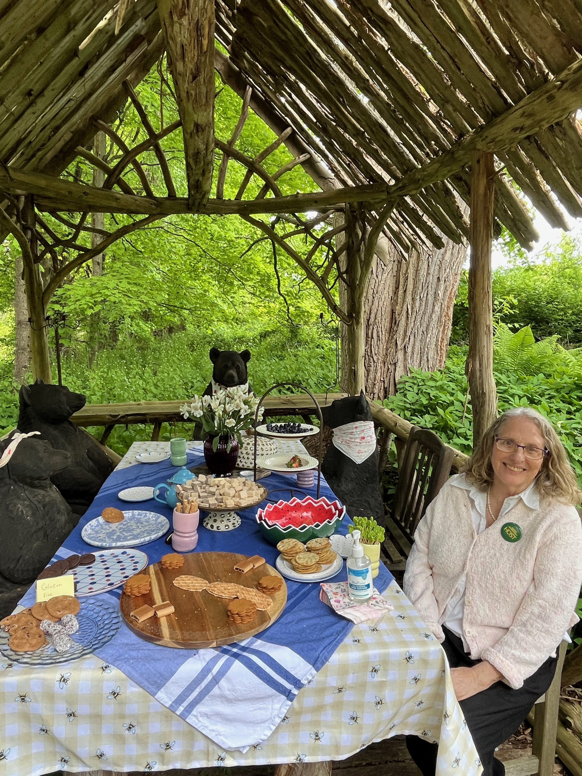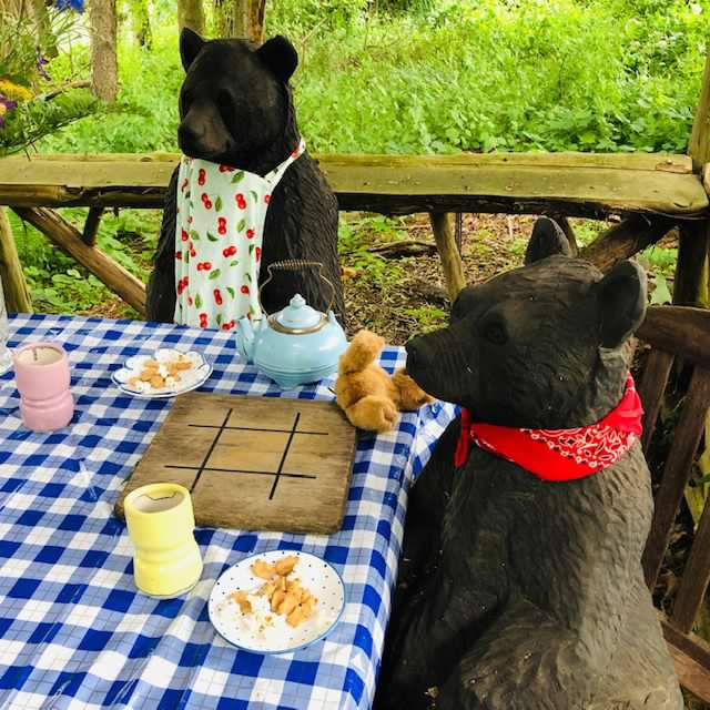 On open garden days, seven hand-carved teddy bears dine on fruits and nuts in their picnic happy place. They have a silvery tea set and handmade dishware. And when they have visitors, we often sing their theme song.